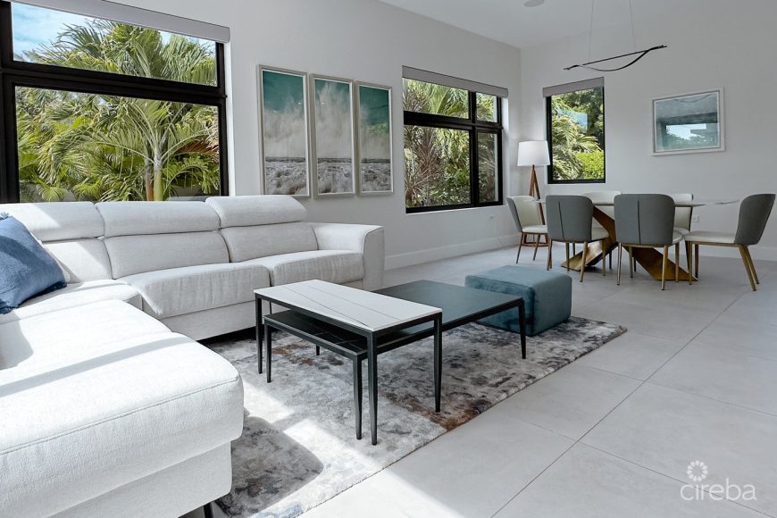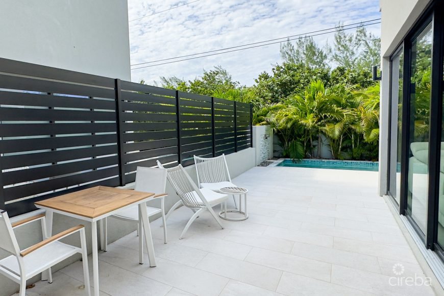 Discover refined Cayman living in this exclusive four-bedroom, 3.5 bath townhouse in West Bay, set within a gated enclave of just eight residences. From the moment you arrive, the sleek architecture and lush landscaping set a tone of sophistication. The intimate scale of the complex offers both security and a welcoming sense of community, creating a lifestyle that blends privacy with connection.