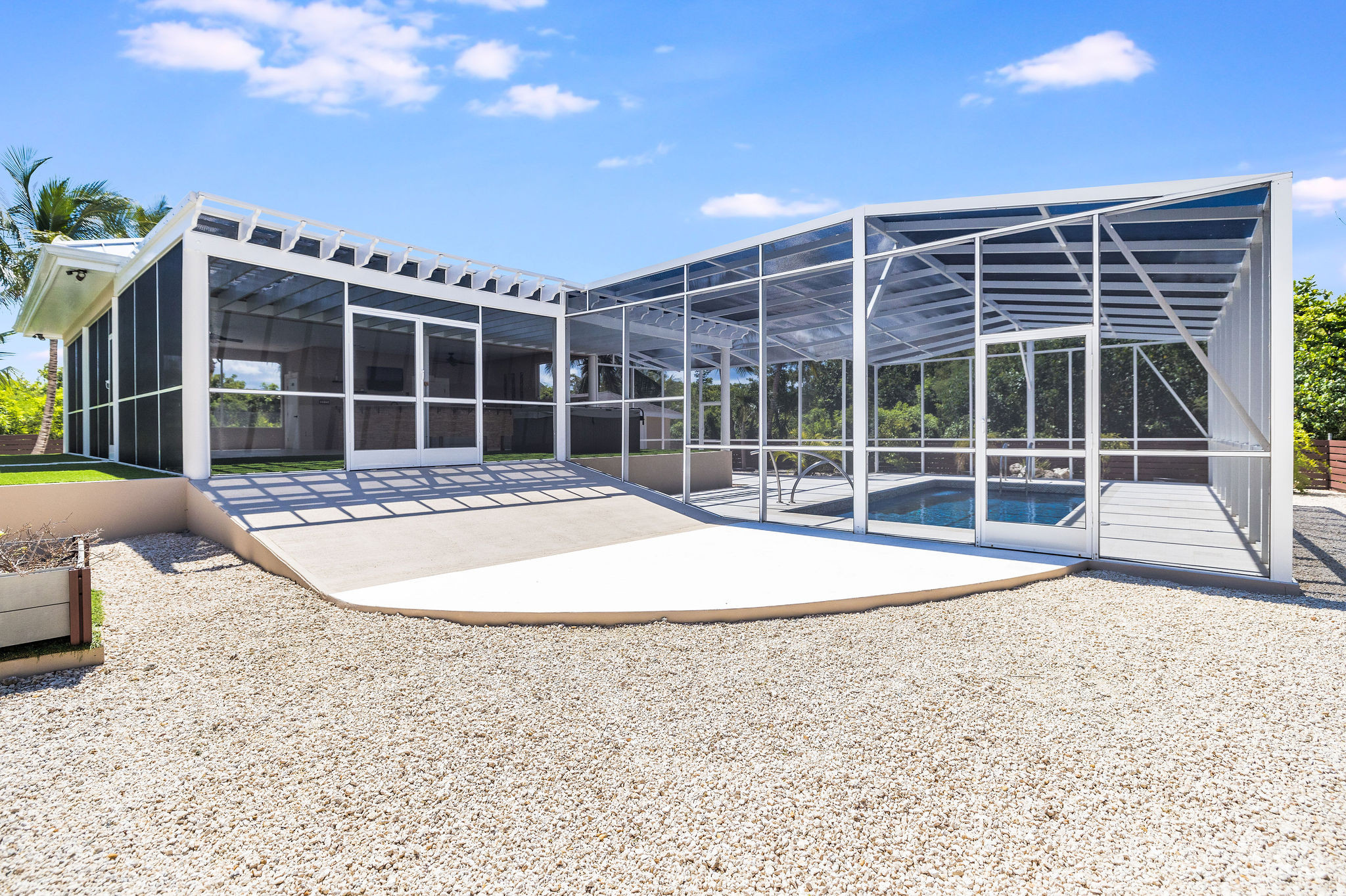 Slide open the glass doors to a fully screened saltwater pool glowing with color-changing LED lights, where you can lounge on the sun shelf, grip the sleek modern rails, or sink into the 6-person hot tub spa under the stars; the private outdoor bar pavilion is an entertainer’s dream with a built-in kegerator, full fridge, Bluetooth surround sound, outdoor TV, full poolside bathroom, and artificial green turf flowing seamlessly from the covered lanai to the bar and spa for zero mud and zero mowing.