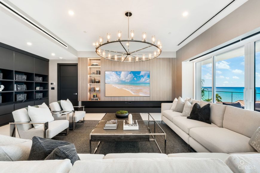 Welcome to Residence 4 at Aqua, a rare full-floor unit with incredible space, privacy and views in the heart of Seven Mile Beach. This fully furnished 4-bedroom, 4.5 bathroom residence sits on the entire 4th floor and offers uninterrupted 360-degree views, from stunning sunsets over the Caribbean to tranquil sunrises on the island side. A massive 50-foot beachfront terrace gives you the perfect spot for outdoor dining, lounging or just soaking in the sunset. Inside, the open-plan layout is bright and airy, thanks to floor-to-ceiling windows and 10 ft ceilings throughout.