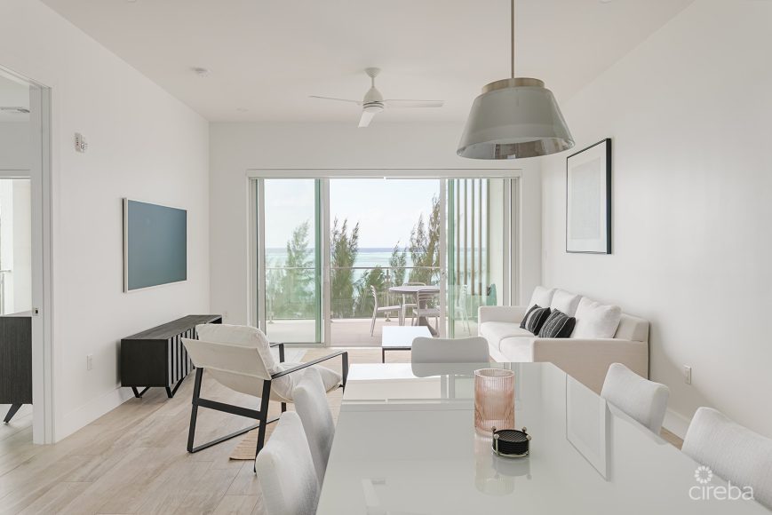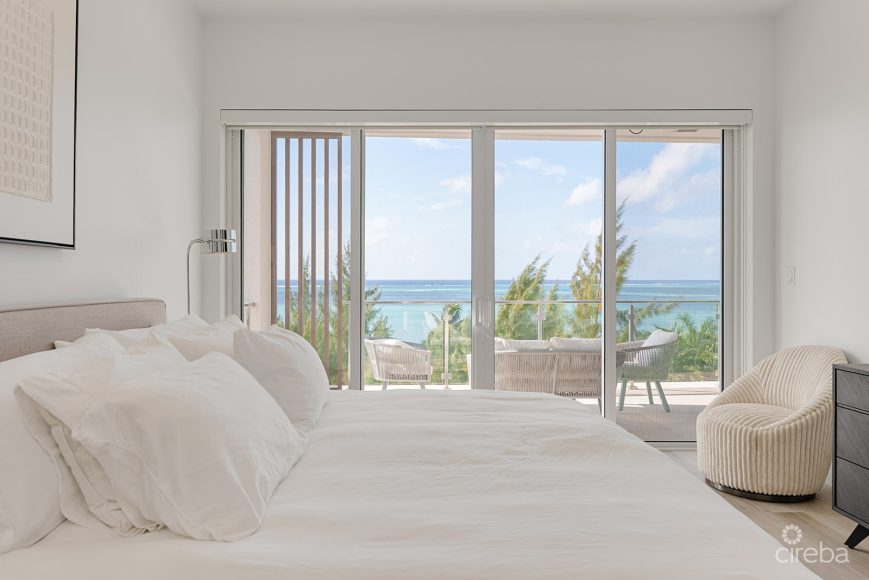 Located on the fourth floor at AURA, this 3-bedroom, 3.5-bathroom oceanfront residence offers 2,020 sq. ft. of well-designed living space with uninterrupted ocean views across South Sound. Spacious, light-filled, and fully furnished by award-winning IDG, the condo is turnkey and ready to enjoy.