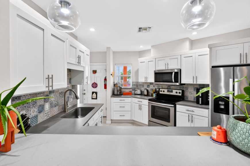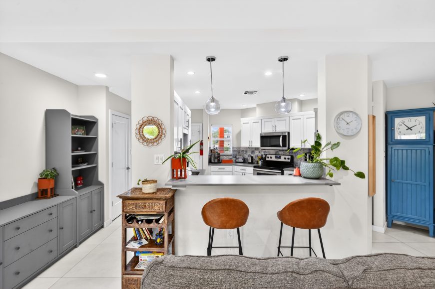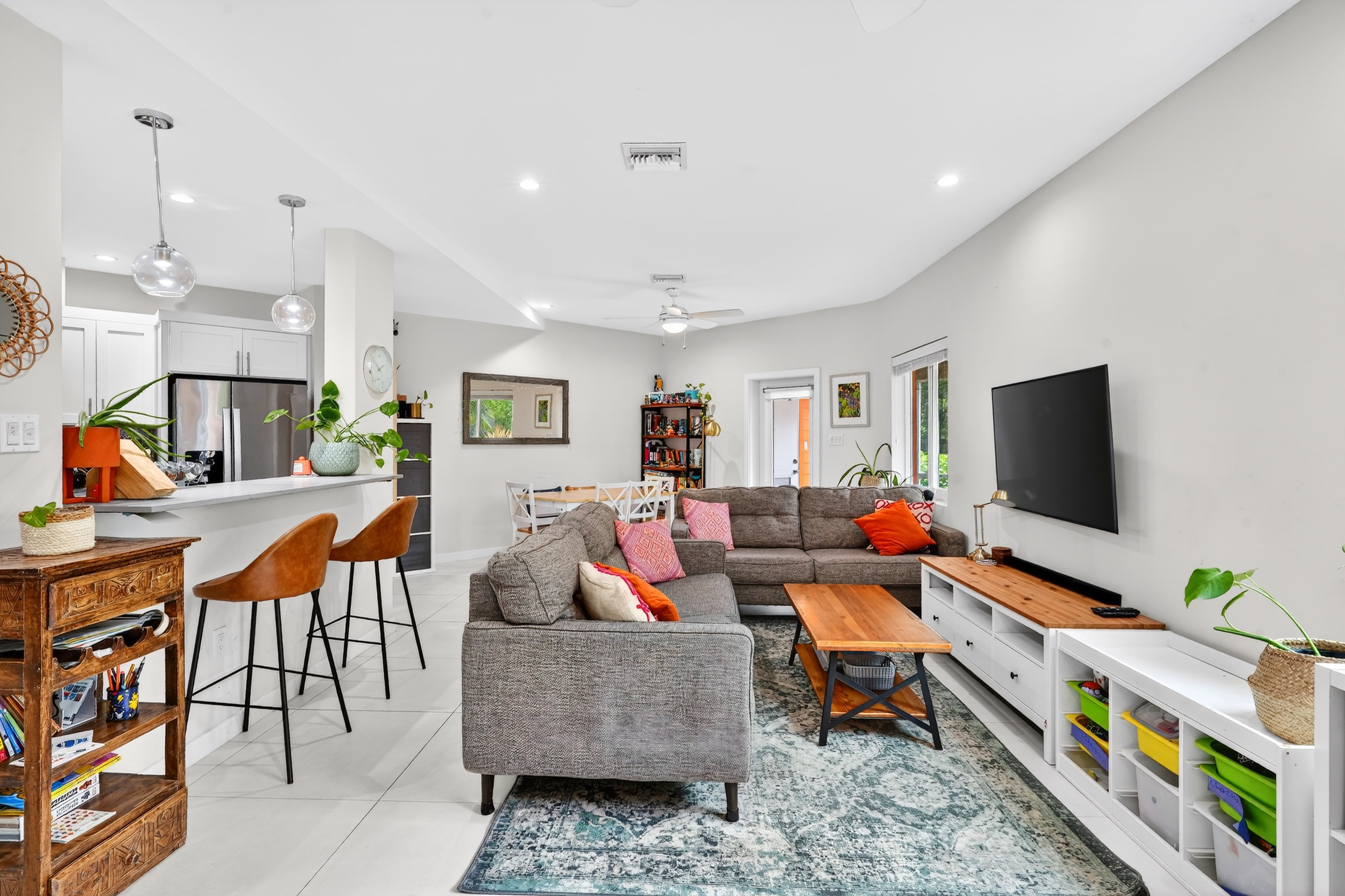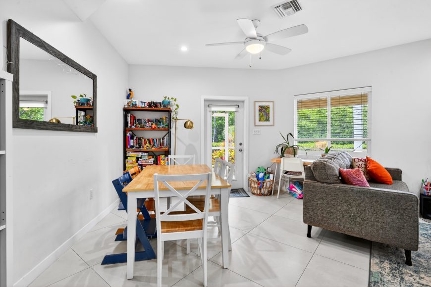 The ground floor features an open-concept layout with a contemporary kitchen flowing seamlessly into the dining and living areas which open onto a screened porch, perfect for relaxing. Upstairs, you’ll find two bright and generous bedrooms along with two full baths and laundry.