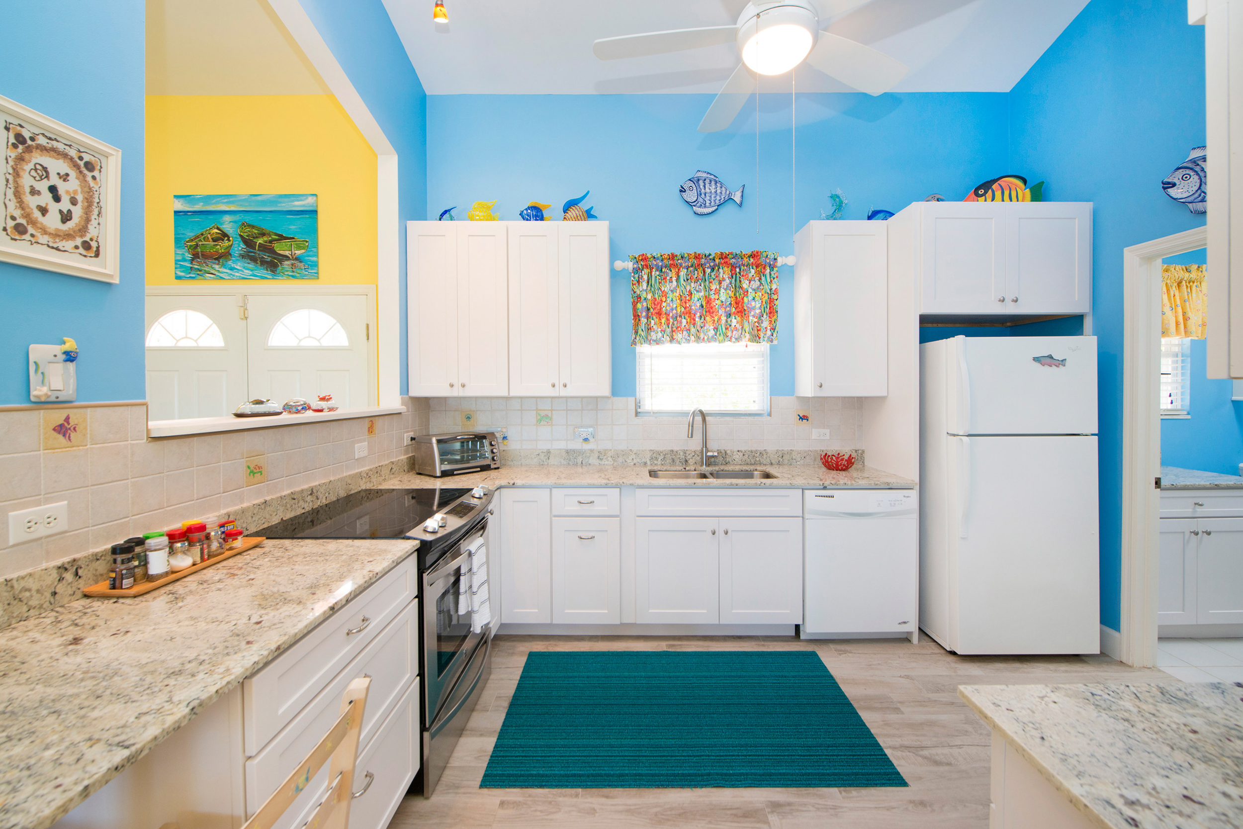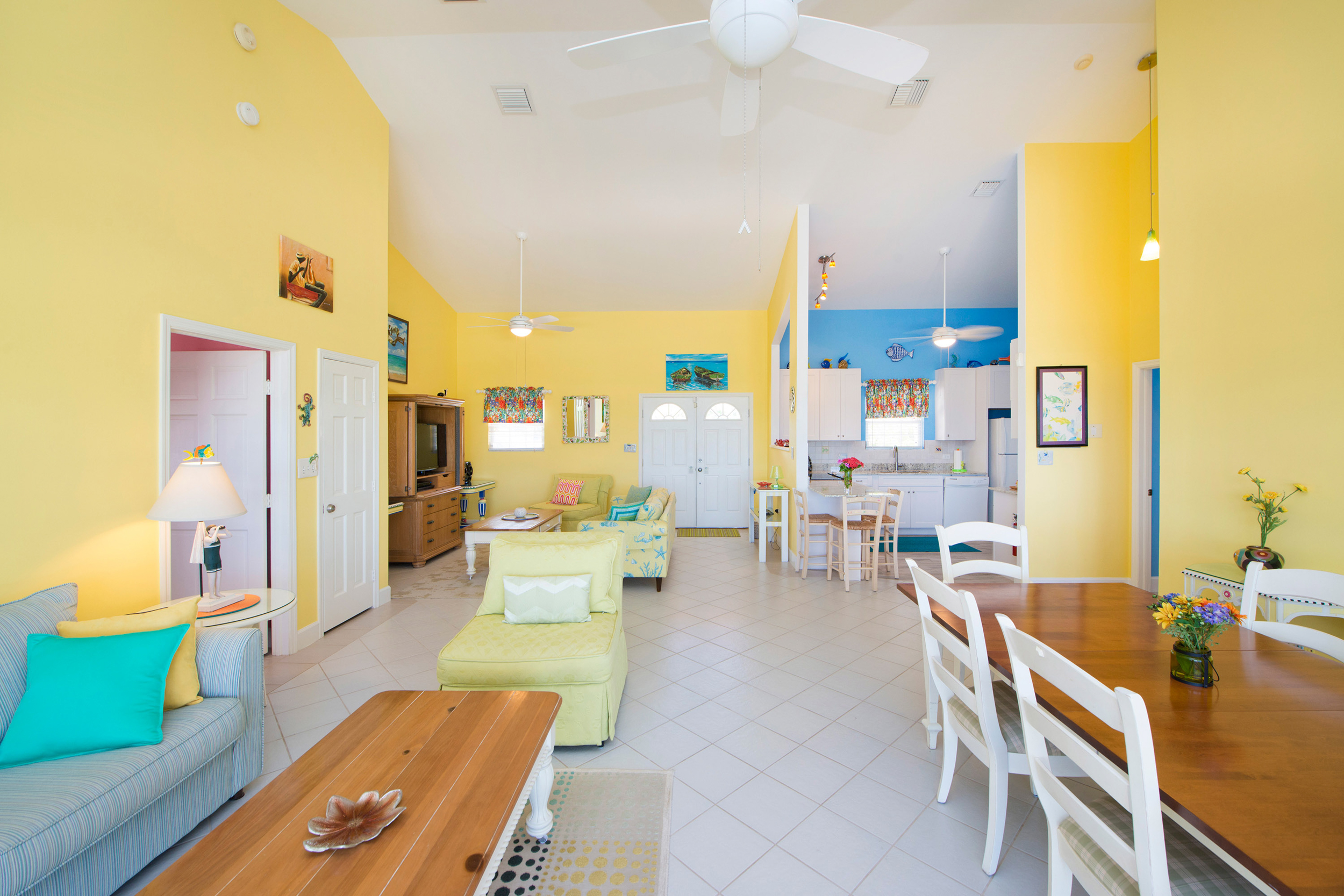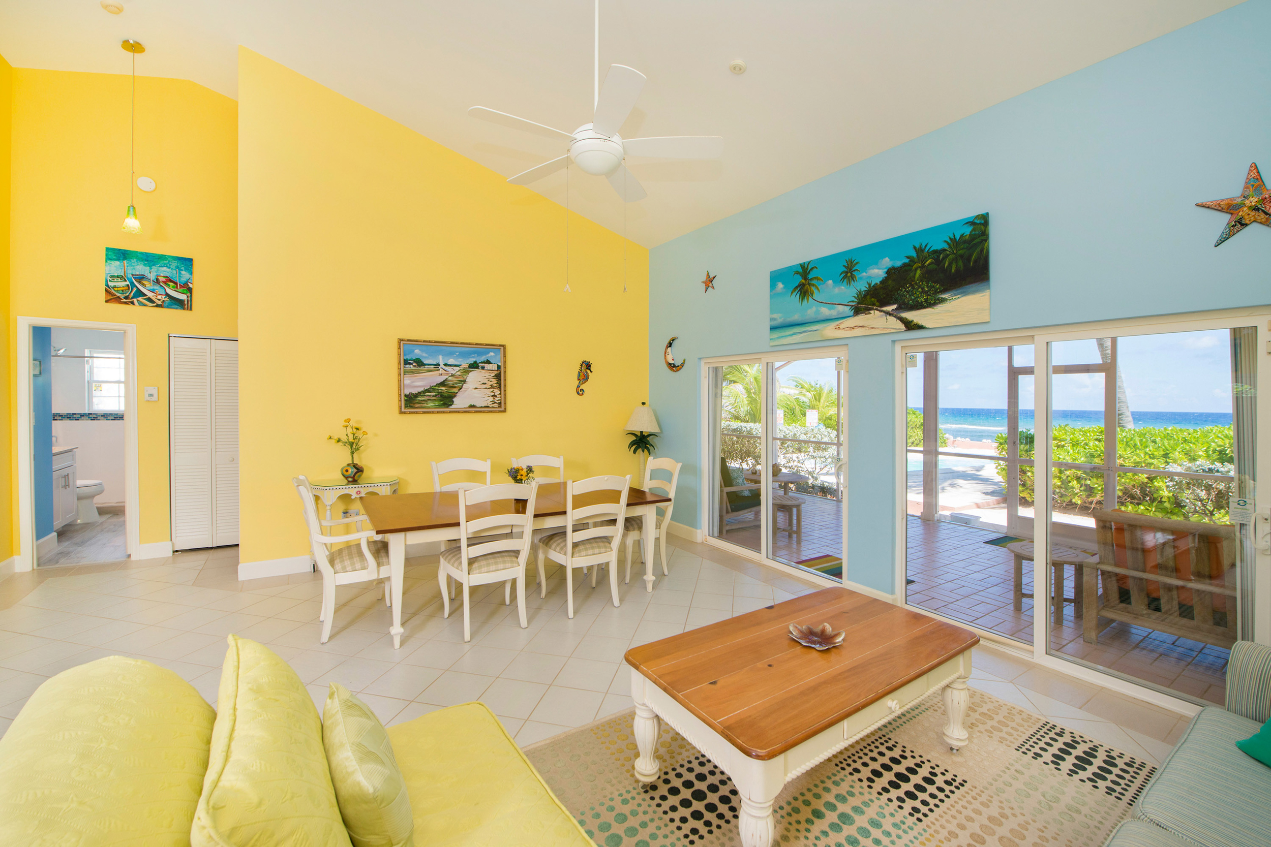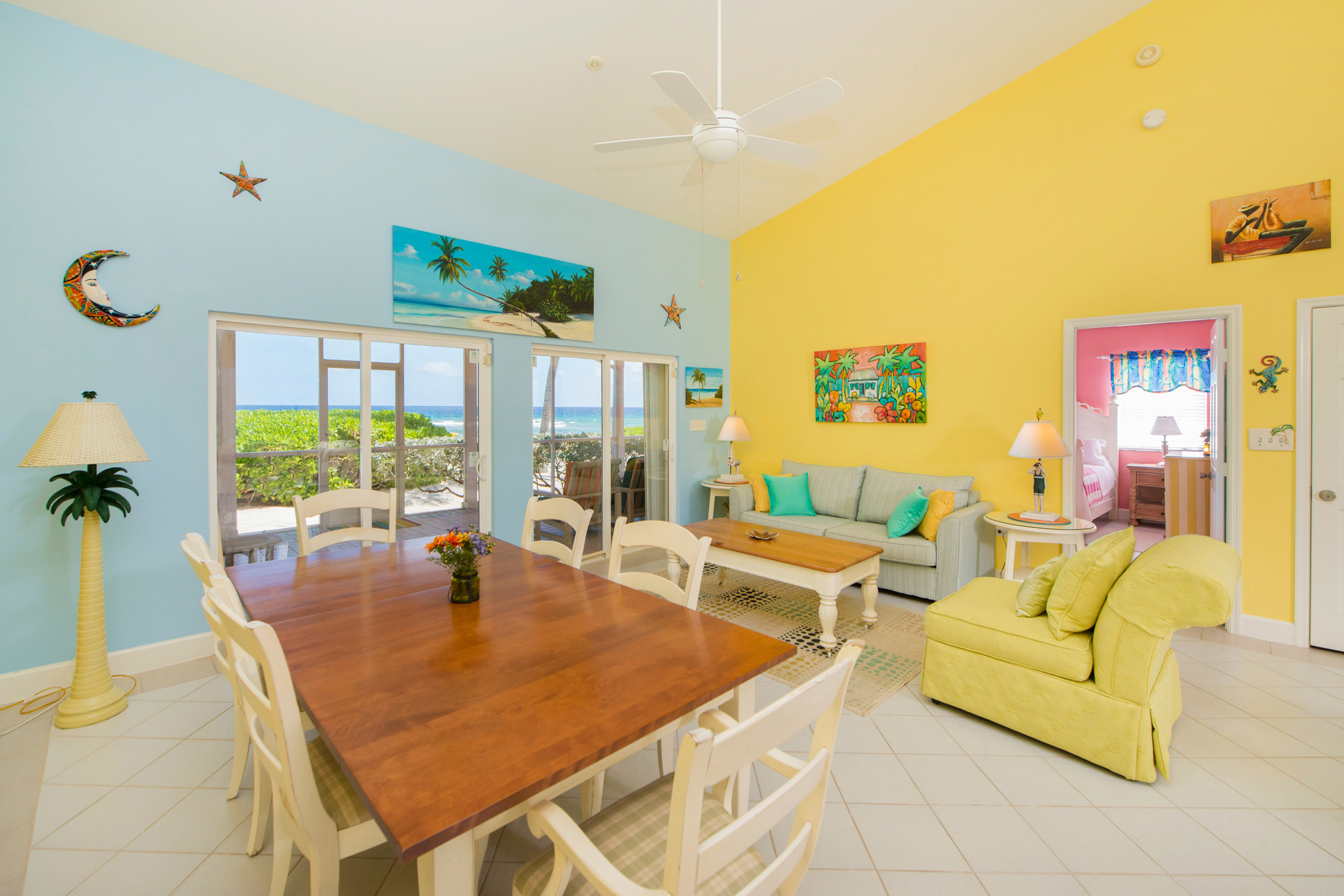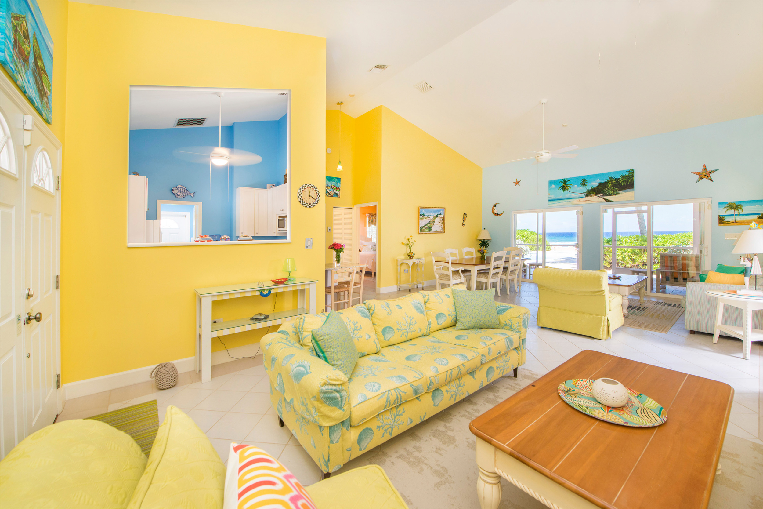 Step inside to find an interior awash in island-inspired color palette that captures the essence of Caribbean living—soft coral hues, ocean blues, and warm sunny tones create an atmosphere of island joy. The thoughtfully designed layout flows seamlessly from living spaces to the screened-in porch, where constant tropical breezes and the gentle sound of waves create your own personal sanctuary.