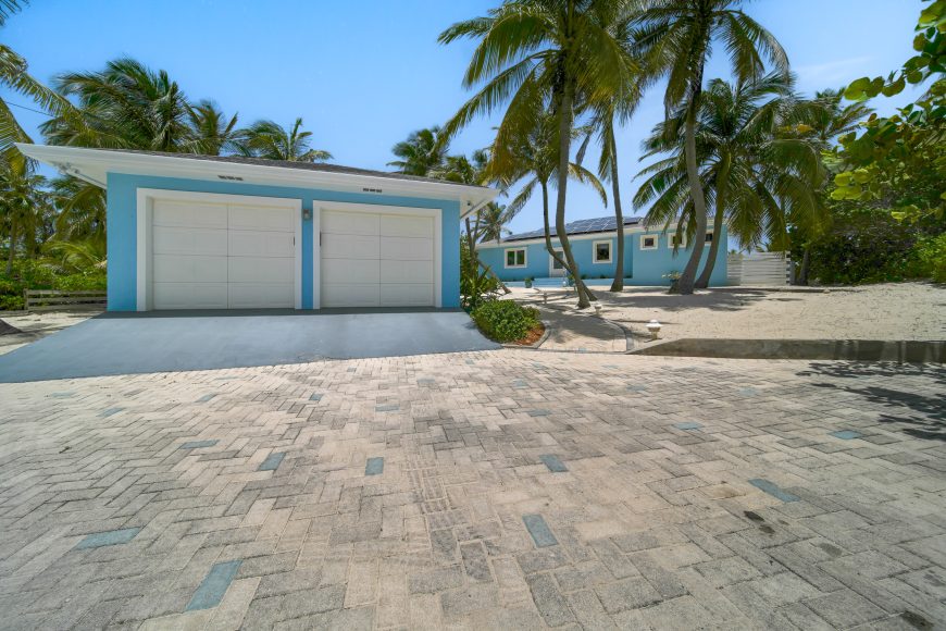 Expansive private lot featuring powdery white sand beach, lush tropical landscaping, and detached two-car garage ensuring both privacy and convenience.