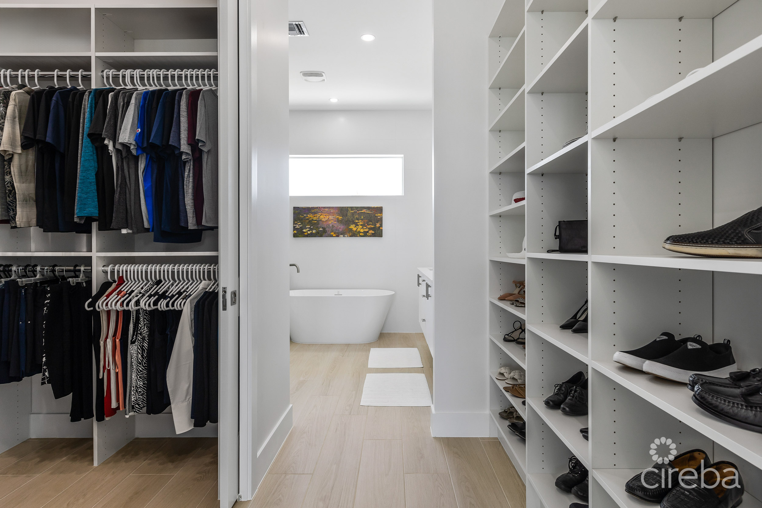 On the second floor the primary suite offers a spa-inspired bathroom with freestanding soaking tub and a glass enclosed shower with 3 shower heads. The expansive walk-in closet includes a wall of display shelving. The primary suite opens to a private balcony overlooking the pool with ocean views. Two additional king sized bedrooms each feature private en-suites and custom cabinetry.