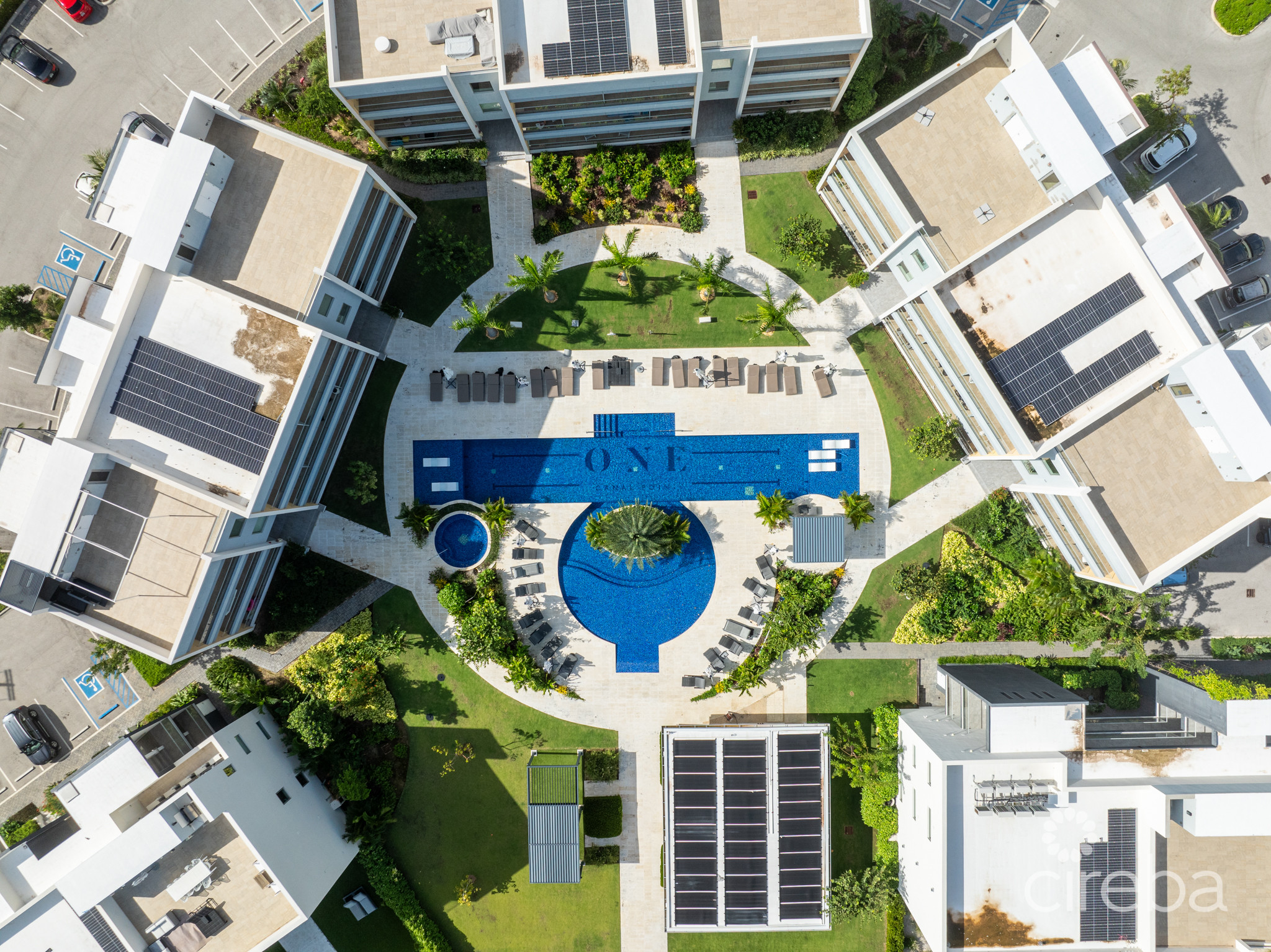 • A resort-style pool with sun loungers and tropical landscaping