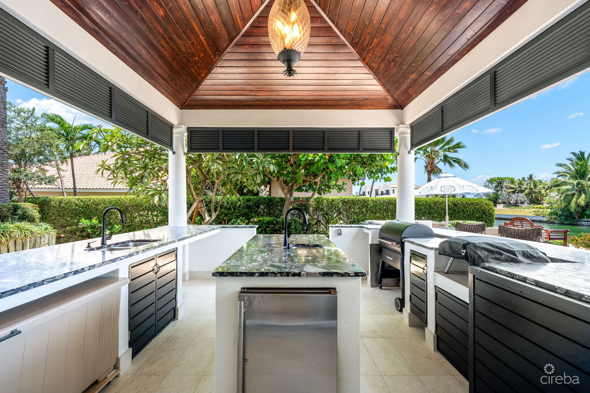 Outdoors, the resort-style setting is pure Cayman paradise. A large custom swimming pool with a 12.5-meter lap lane invites both fun and fitness, complemented by a jacuzzi and outdoor shower. The expansive covered patio captures the cooling trade winds and features automatic retractable screens for year-round enjoyment.