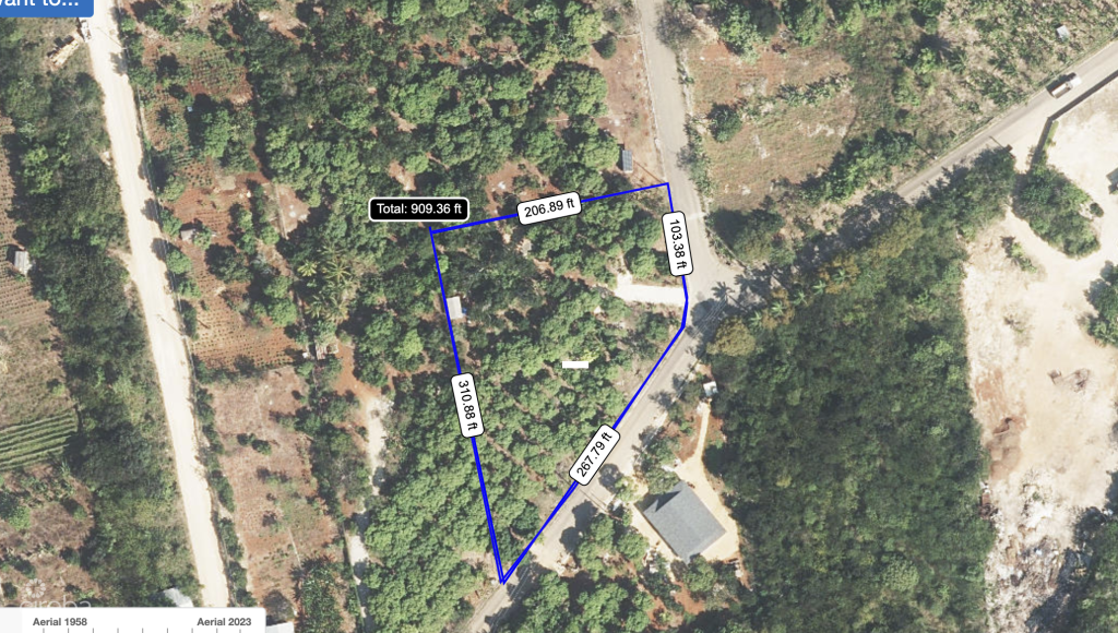 (Drone shot boundary lines are approximate; Lands and Registry map w/ measurements is accurate)