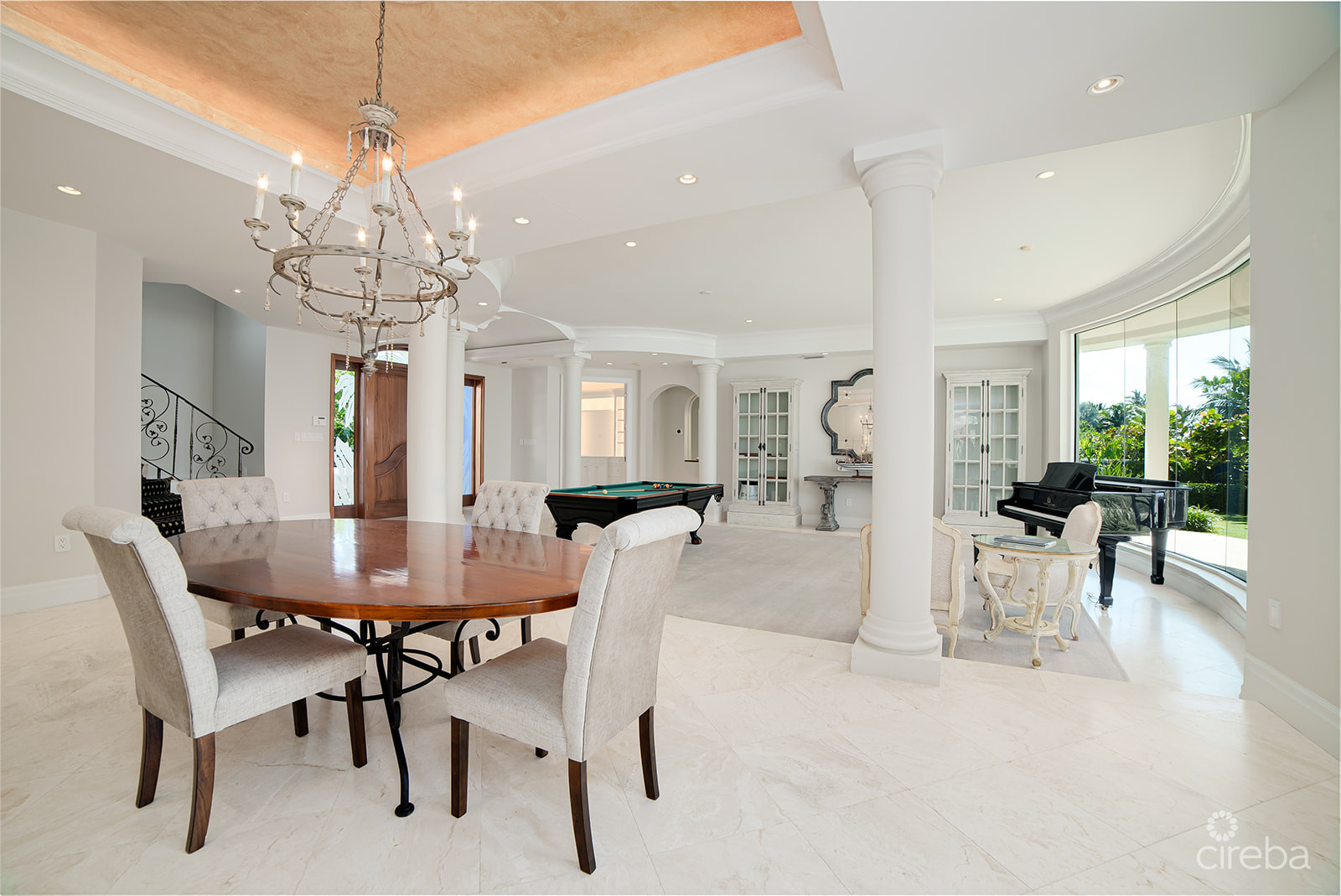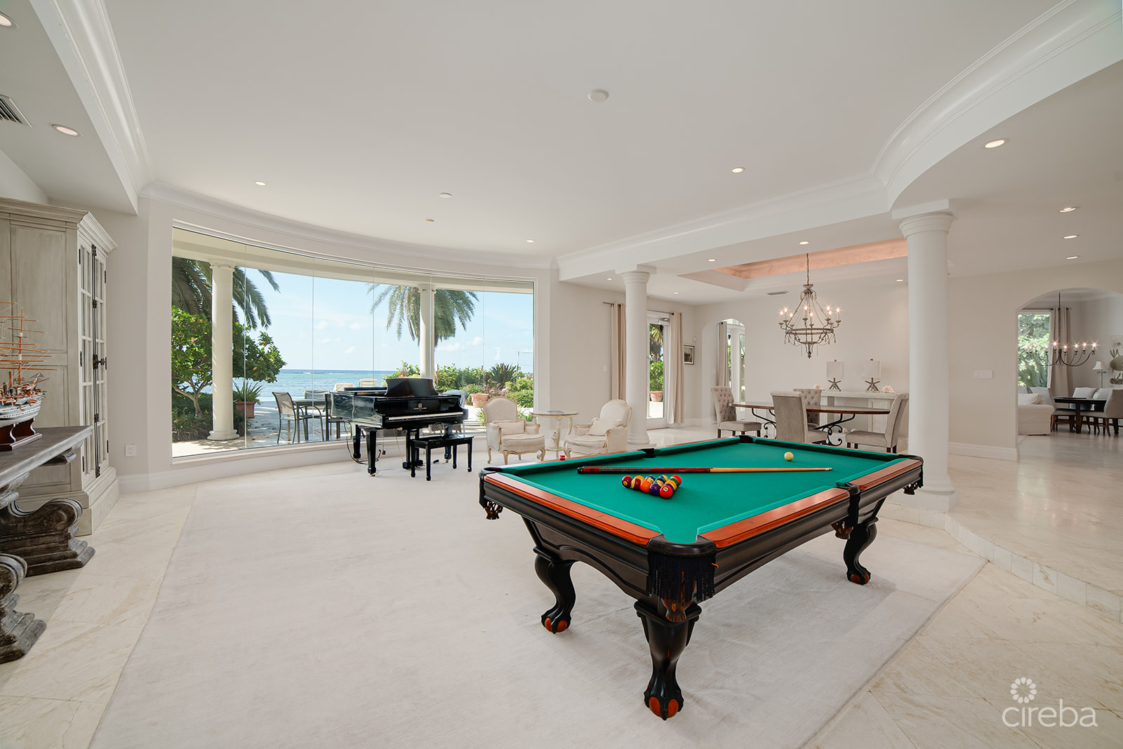 Inside, the home is bright and open, with floor-to-ceiling windows that frame the ocean from nearly every room. Select areas feature 15-foot ceilings, adding to the sense of space and natural light. The layout balances formal and casual areas, creating a comfortable flow between spaces for both everyday living and hosting.